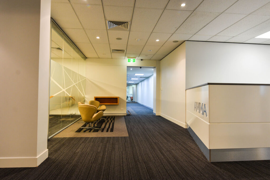 Due to significant business expansion AMMA made the decision to expand on their existing premises and Inbuilt was selected by the designer and client to deliver and improve the general accommodation. The Designers took future proofing of the new workspace as a primary driver and tasked Inbuilt to adjoin the two existing occupancies to create one large stylish and highly functional business environment which can grow with AMMA into the future. This entire project was completed in a short time frame of 9 weeks on site causing little disruption to the existing staff through careful scheduling and planning – a hallmark of Inbuilt projects.